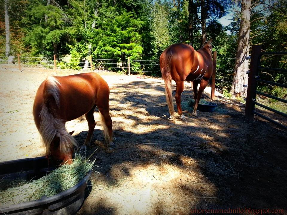 I woke up the next morning at seven. My bed was cozy but I got up to go feed the horses. I love having a real reason to get out of bed - work just doesnt motivate me like feeding horses does! So I put on a zip-up hoodie and headed out. I grinned as I saw both horses look out the gate to me. Milo large and first, and the little guy close beside him. They both nickered happily - hearing the little guy nicker for the first time was cool!